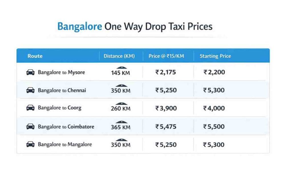 Book one-way drop taxi in Bangalore at best prices. Reliable oneway taxi service for airport, city & outstation rides. Fares start from ₹999.